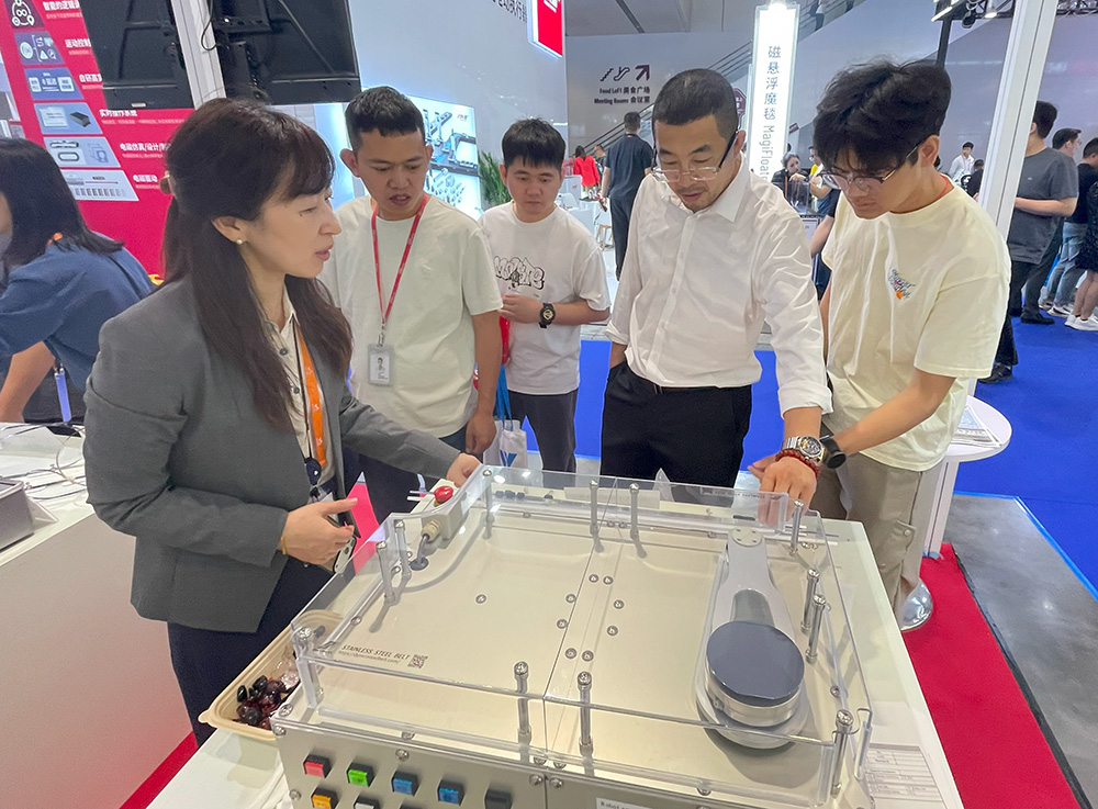 スチールベルトを使ったコンベヤに興味を持つ訪問者