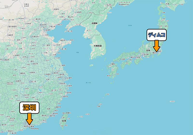 ディムコと中国の深圳は直線距離約 2865km 離れています