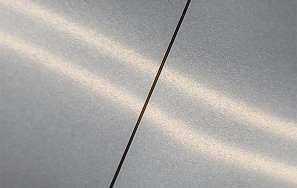 薄肉のスチールベルトを跨ぐ一筋の美しい溶接線(画面中央)